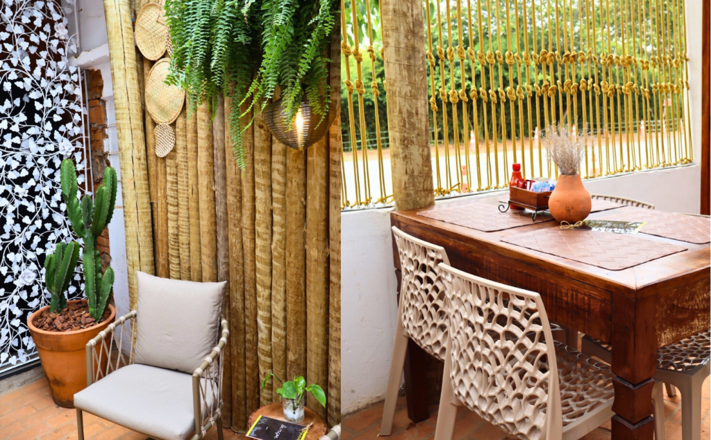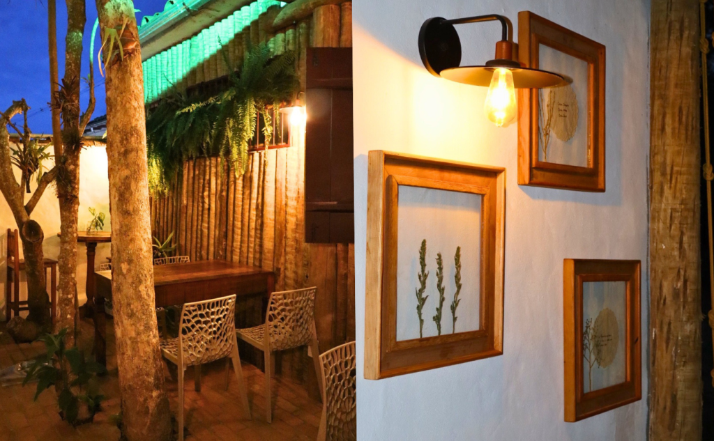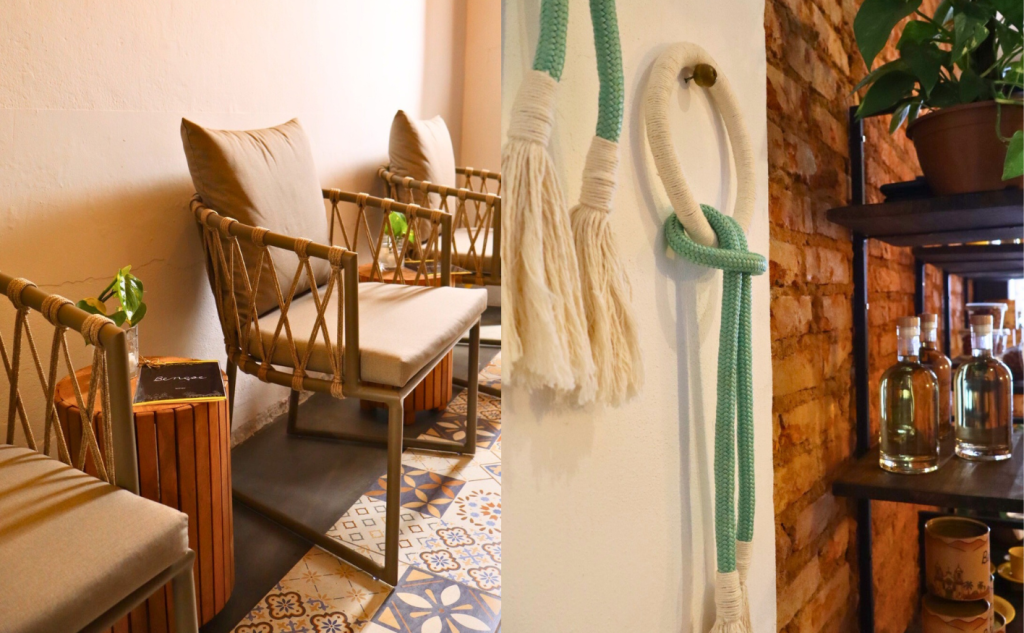 O espaço mescla paredes brancas e tijolos expostos, texturas naturais, elementos de madeira, tramas artesanais, plantas e objetos em cerâmica que adornam o ambiente de forma suave. É um ambiente vivo, orgânico, que conversa com a natureza ao redor e com a identidade mineira que valoriza o acolhimento antes de qualquer coisa.